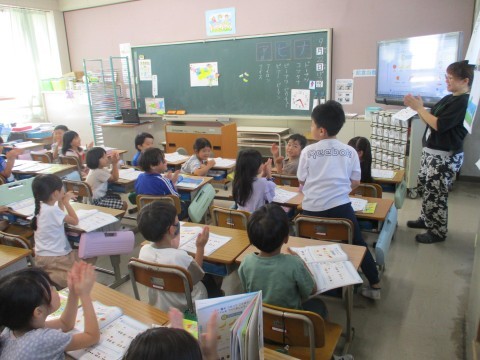 2組の国語です。かたかな「ソ」の学習をしています。「ン」と「ソ」のちがいをみんなで考えていましたよ。