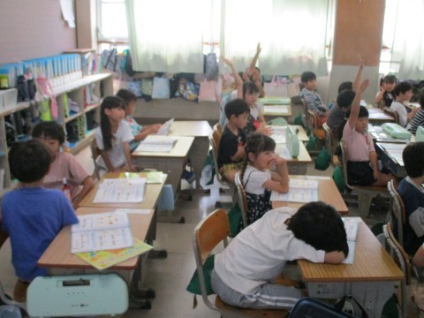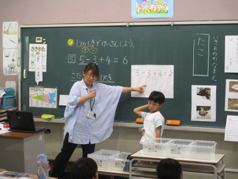 1組の算数です。10より大きい数のたし算,ひき算をしています。黒板に答えを書きたくてしようがないこどもたちでした。