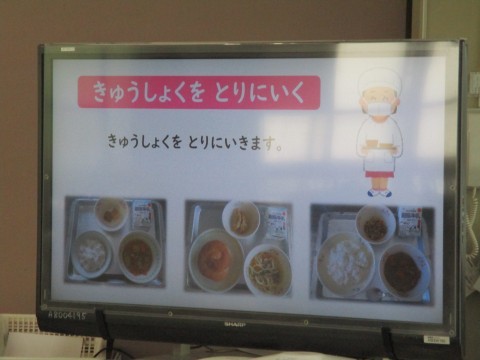1組でも給食に備えて練習です。本物のお皿やおぼんを使って配膳の練習をしていました。みんな上手にできていましたよ。