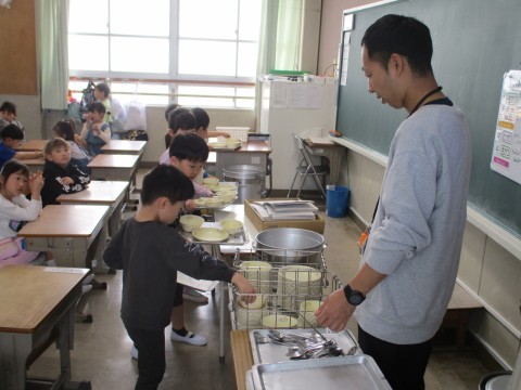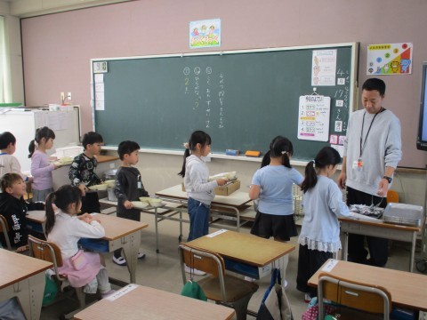 2組では,今日から始まる給食に備えて先生がいろいろとお話をしています。