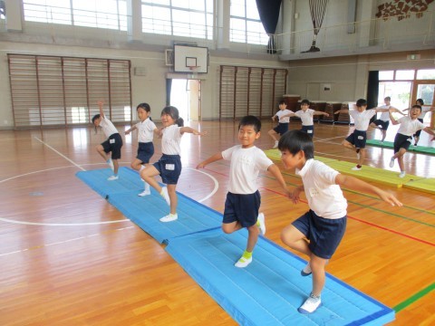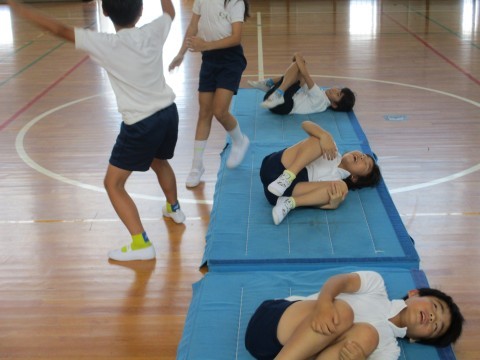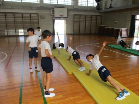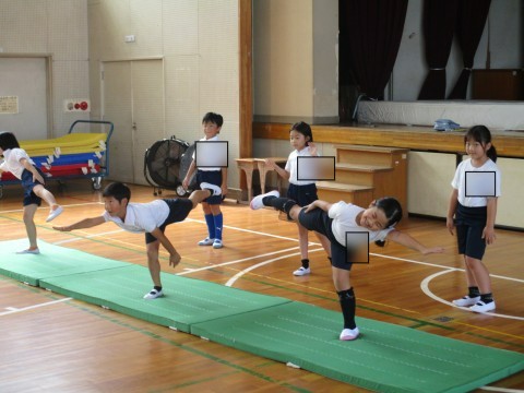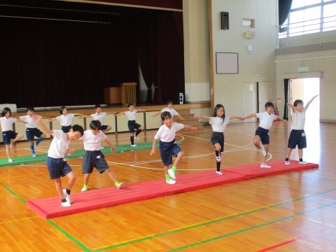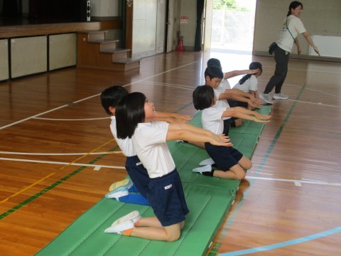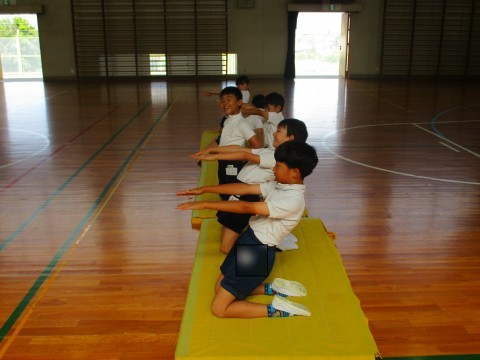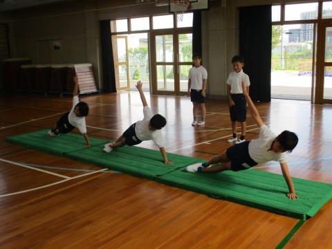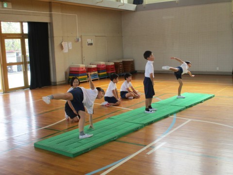 3組の体育です。いろいろな器械運動に挑戦しています。バランスをとるのが難しくて,体がゆらゆらしてしまうけど,それも楽しい!!