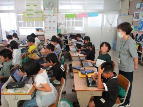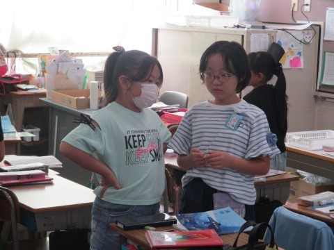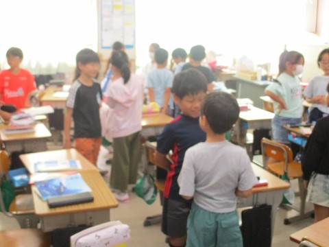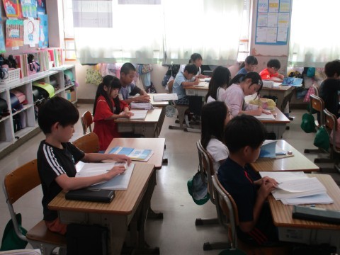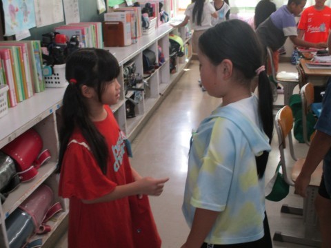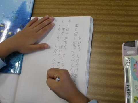 1組の国語「ちいちゃんのかげおくり」の学習です。場面のようすを比べて読み,その違いについてノートに書いていました。書いた後は,友だちとお互いの考えを交流しました。