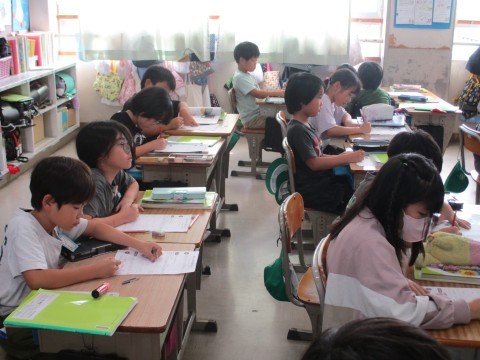 1組の国語「ちいちゃんのかげおくり」の学習です。場面のようすを比べて読み,その違いについてノートに書いていました。書いた後は,友だちとお互いの考えを交流しました。