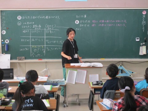 1組の理科です。日なたと日かげの地面をくらべた結果について話し合っていました。