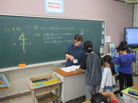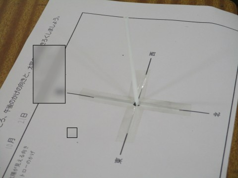 2組の理科です。時間の経過とともにかげのむきを調べます。太陽に位置に着目できるかな?