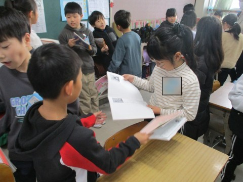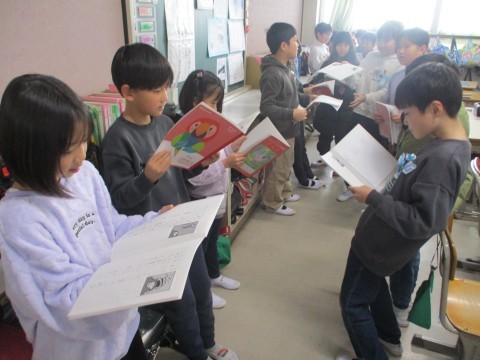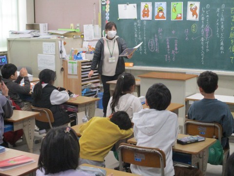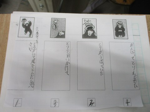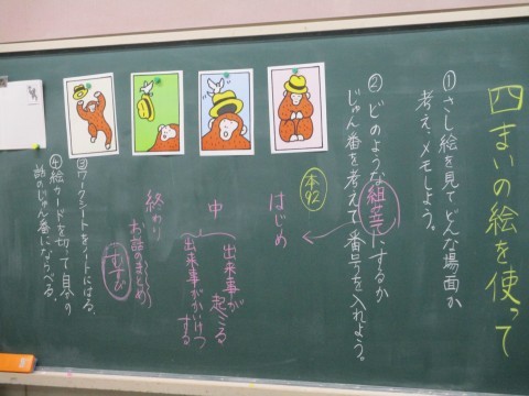 2組の国語「四まいの絵を使って」の学習です。4枚の絵を自由に並びかえて,起承転結のお話を作ります。こどもたちの想像はさまざまで,一人ひとり全く違うお話を思いつくんですね。