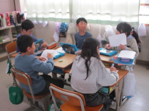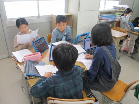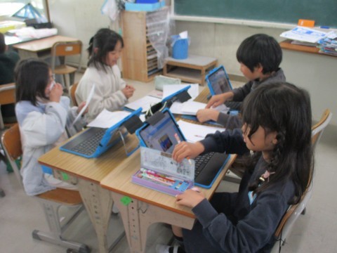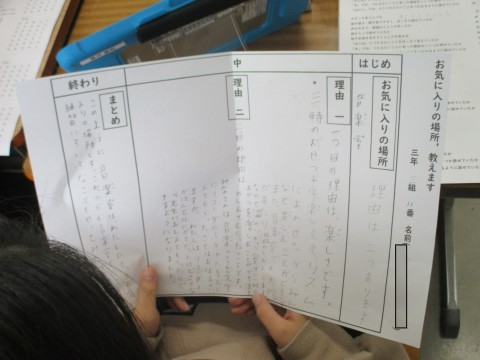 3組の国語「お気に入りの場所,教えます」の学習です。自分のお気に入りの場所について,理由を明確にしてスピーチします。友だち同士,相互評価しながら互いのスピーチをききあいました。めざせ!スピーチ名人!