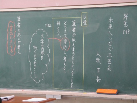 2組の国語「未来へつなぐ工芸品」の学習です。単元の目標について先生からお話がありました。「要約」がテーマのようです。