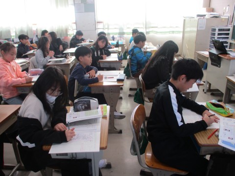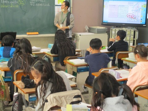 3組の算数です。「がい数」の練習問題を解いていました。終わった人はドリルパークで学習しています。
