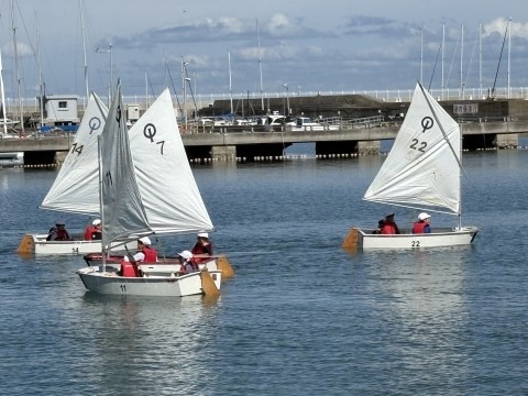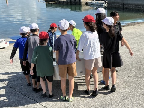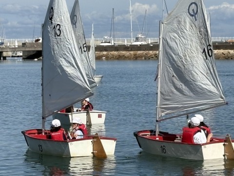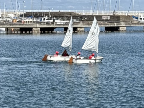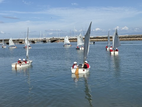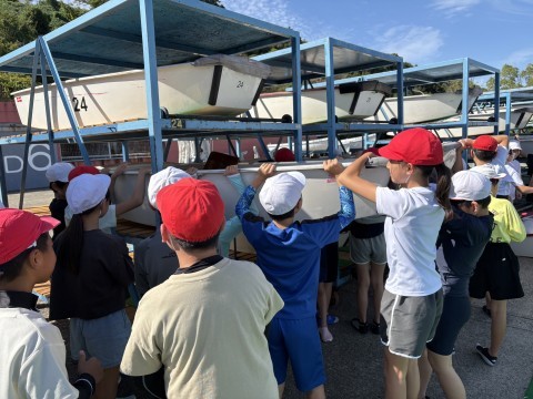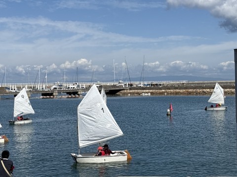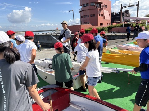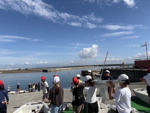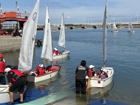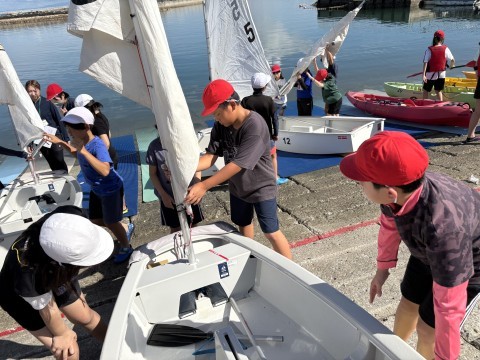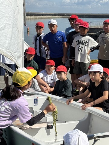 ヨットに乗船中。行きたい方向に舵を操作したり、帆の張り具合を調整したりと工夫しながら頑張っています。
