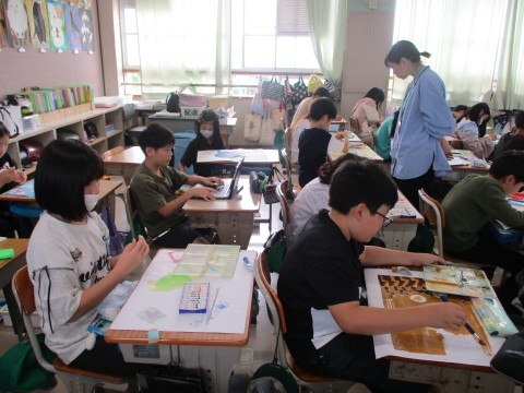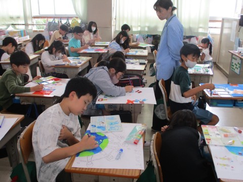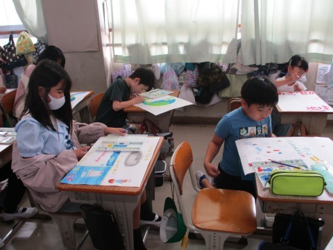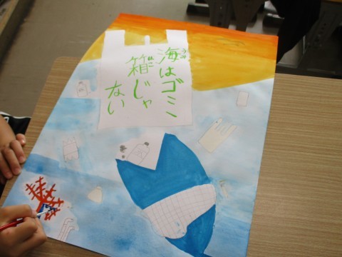 2組の図工です。環境や人権などをテーマにポスターを制作していました。いろいろなメッセージがありますね。