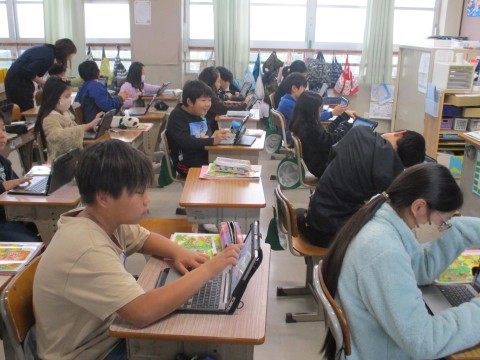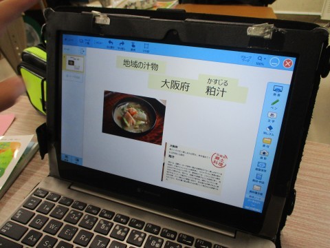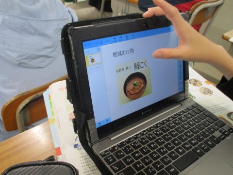 2組の家庭科です。地域の汁物と日本の保存食について,タブレットで調べて,資料にまとめています。