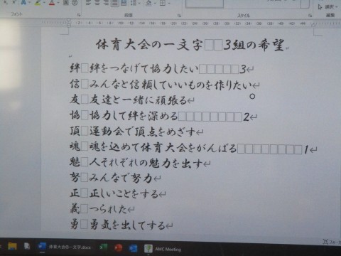 5年生は体育大会でクラスごとに願いをこめた一文字を決めるようです。こどもたちが司会をして,みんなの思いを出し合います。いろいろな漢字がならんでいますが,それぞれにこどもたちの願いがありますね。きっとこの願いは,体育大会中の練習を通して目標となり,自分たちがちゃんと目標に向かっているかを振り返る材料になることでしょう。
