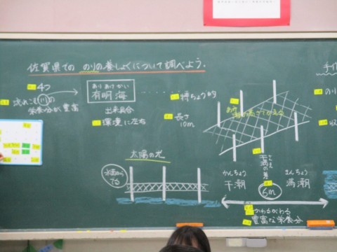 5年生の社会です。佐賀県ののりの養殖業について調べたことをもとに話し合っています。このクラスでは学級全員で話し合うときの座席配置がきまっているようで,こどもたちが互いに顔を見合って話し合うことができるようになっています。