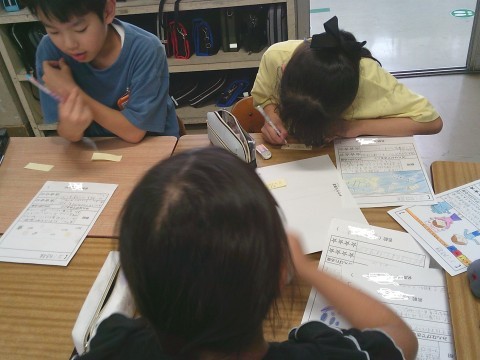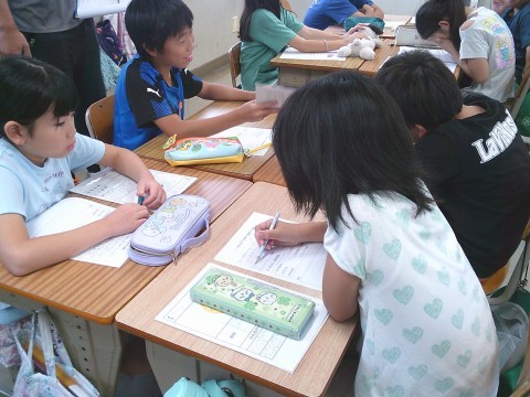 3年生の総合的な学習の時間です。ここでは、高齢者の疑似体験をしています。軍手をはめ、耳栓をした状態で本をめくったり、ペンで字を書いたり、お箸を使ったりする体験をしました。普段あたり前にできていることが難しくなりますね。