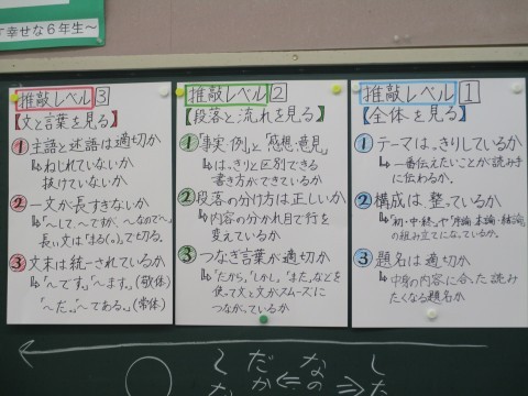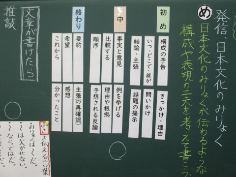 六年生の国語です。日本文化の魅力について発信する文章を書きます。6年生のこの時期になると,特定の相手に書くのではなく,広く自分の考えを発信する文章を書くのですね。かなり構成力や表現力が問われます。しかし,実はこどもたちは6年間の学習の中で,「書くこと」において大切なことをたくさん学んでいます。