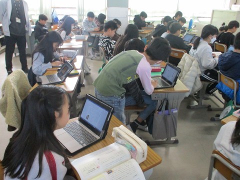 3年生の総合的な学習の時間です。9日の学習参観にむけて,これまで福祉について学習したことを発表する準備をしています。タブレットや画用紙など自分で決めたツールを活用して発表します。「課題設定→情報収集→整理・分析→まとめ・表現」の探究のサイクルの最後の過程になりますが,次はまた新たな課題設定から2周めのサイクルに入っていきます。