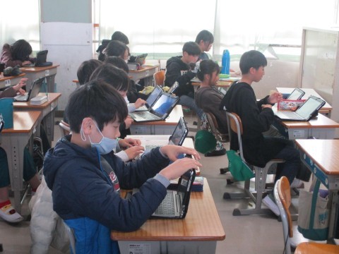 3年生の総合的な学習の時間です。3年生は,1学期から「登南は,だれにとっても過ごしやすい町なのか?」という問いをもって学びを進めてきました。1学期はユニバーサルデザインについて学び,2学期からは体の不自由な方々の立場に立って疑似体験をしたり,調べ学習をしたりしました。今日は,調べたことを伝え合い,次の課題を見つけることがめあてです。こどもたちが主体的に学び合う姿がたくさん見られました。