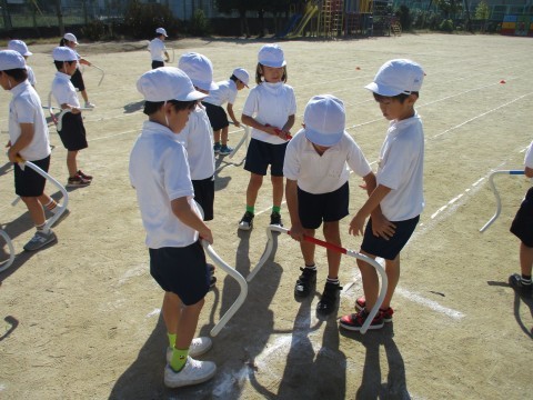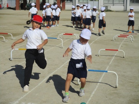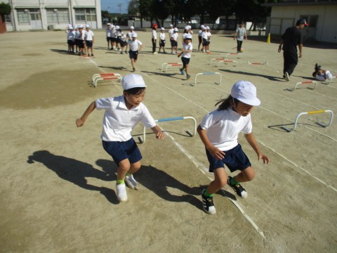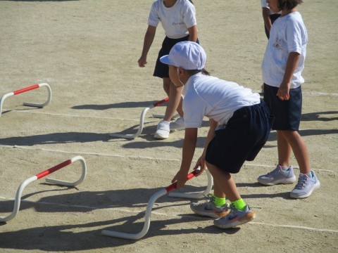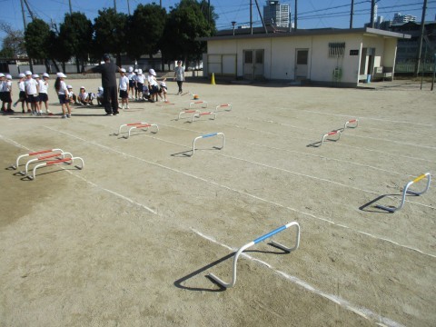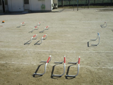 こどもたちは,ミニハードルの置き方を考え,より面白くなるように置いていきます。ハードルを3つも近づけてみたり,後半にたくさんハードルをおいたりとこどもたちなりの工夫が見られました。