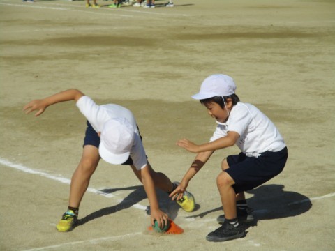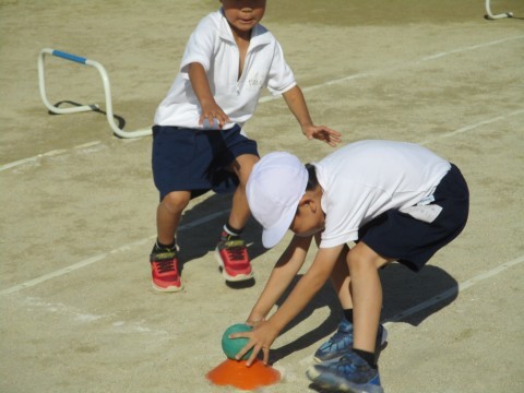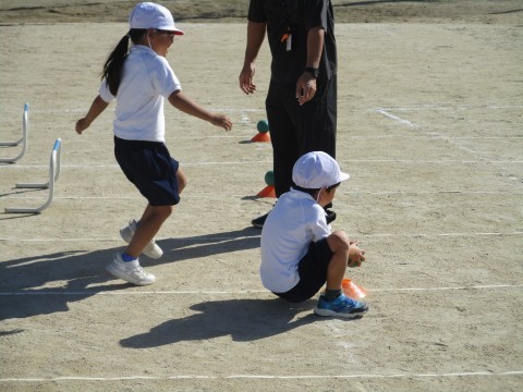 1年生の体育のようすです。2人で20mほど先に置いてあるボールを取り合う鬼遊びをするのですが,先生はそのコースづくりをこどもたちに委ねました。