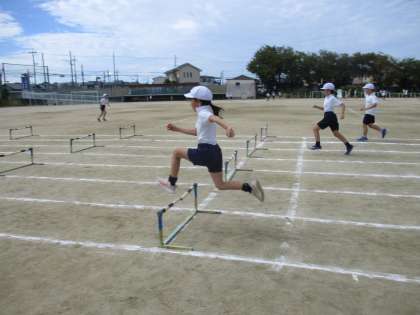 位置について,よーい,ドン! で,向かった先にハードル。ハードル走に取り組んでいました。