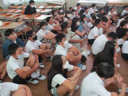 5年生が学年で集まって、保健室の先生のお話を聞いていました。宿泊学習を前に、思春期の体と心の変化について学習しました。