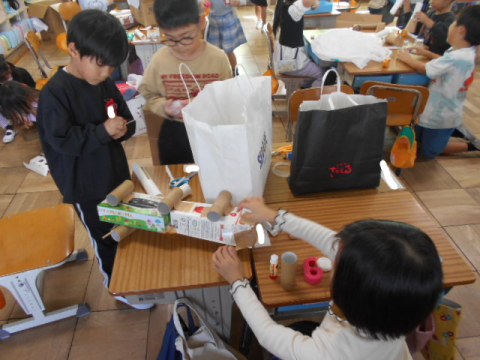 算数のかたちあそびの学習です。各家庭から,いろいろな形のはこを持ってきました。