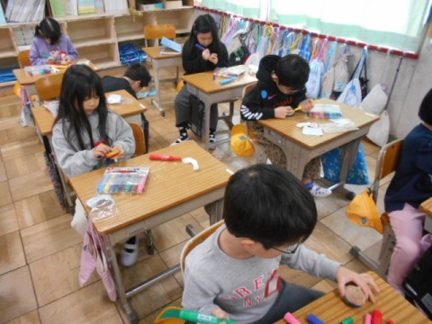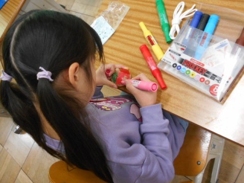 最初に,木のコマに色付けをしました。自分の好きな色を塗ったり,模様を描いたりしていました。「回すのが楽しみ!」「はやく回してみたい」と