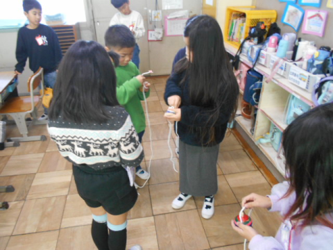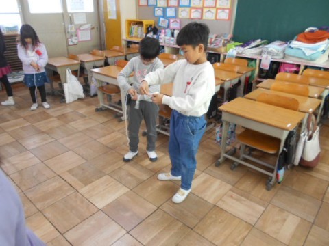 楽しみにしていた子ども達…。早速コマ回しをしてみました。コマの紐がうまくできなかったり,コマが回らなかったり…