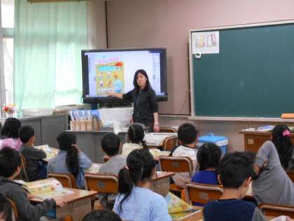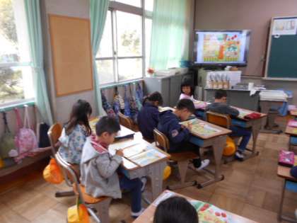 教科書の挿絵を見ながら,数を数えています。大型テレビを指しながら,わかったことを発表しました。