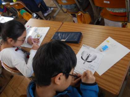 アブラナの花には,実になるところがあるのでしょうか。実際に咲いている花の1つを取り,虫眼鏡で観察します。