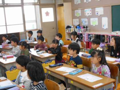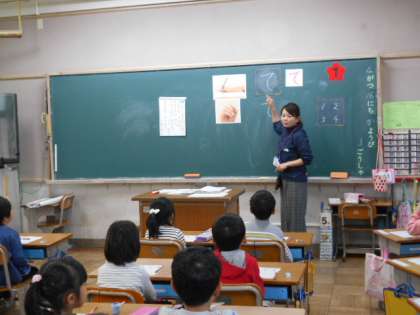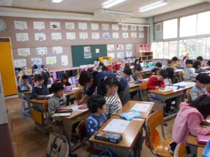 「て」の練習をしています。先生がみんなのそばへ来て丸を付けています。みんな一生懸命です。