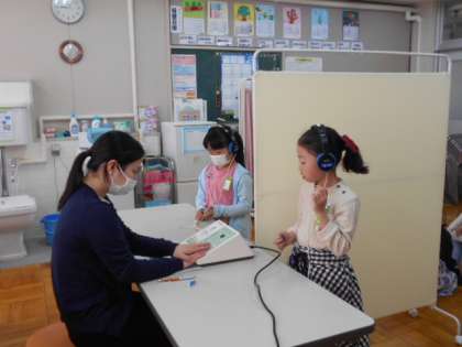 3年 聴力検査(17日の様子) 公開日 2019/04/18 更新日 2019/04/18 3年生 今日は聴力検査です。しっかり聴くことができるようにとても静かに行っています。入室時も靴をきれいにそろえてマナーよく取り組むことができました。