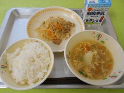 今日の大おかずは「トック」というスープですが、トックとは韓国料理に使われる餅のことです。楕円の形で薄いですが、普段たべている米からできているので、もち米が原料のものよりも、のびにくく給食にはむいています。1年生は「おもちだいすき」と話していました。