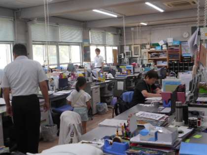 学校の中にどんな場所・ものがあるのか,どんな人がいるのかを探検しています。校長室や職員室を探検した1年生,見つけたものをしっかりとかいています。