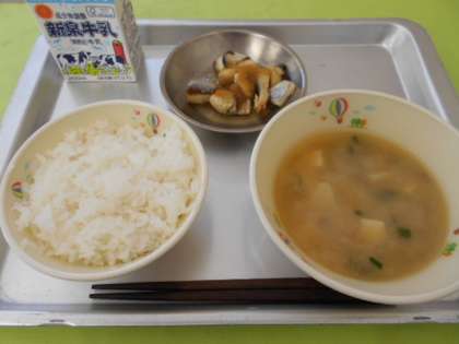 今日の大おかずの呉汁は、群馬県の郷土料理です。『呉』は大豆を挽いたもので、大豆の加工品をつくる際のはじめの工程です。今日はみそ汁にその挽割りの大豆を入れたお汁で、豆腐も入っているので、大豆の栄養いっぱいのお汁になっています。