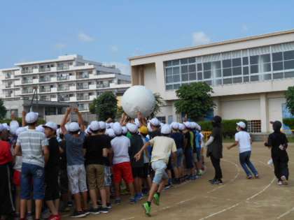 今日の児童朝会では,体育大会の時に実施できなかった大玉送りを行いました。みんなで力を合わせて大玉を送ります。2回戦行い,白組が勝ちました。