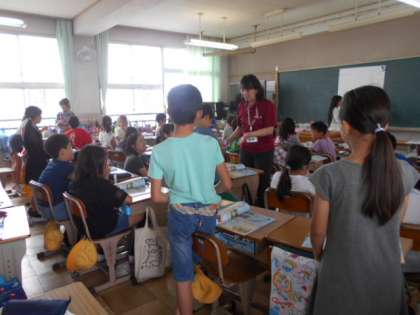 お米の袋に名前と産地がのっています。どの都道府県で取れた何という米かを発表し,大きな地図上に表していきます。