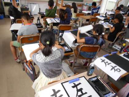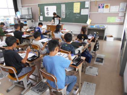 習字の学習です。筆の使い方をよく考えながら,一字ずつていねいに書いていきます。