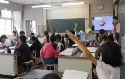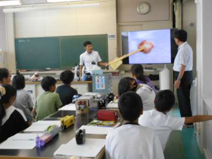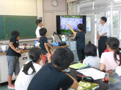 植物の水の通り道を調べています。根から茎,葉へと水の通り道があり,葉の気孔から水を蒸散させています。顕微鏡とモニターをつないで見るとよくわかりますね。