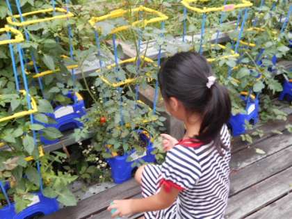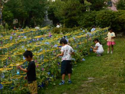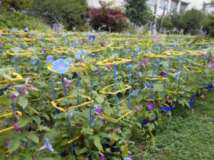 1年生の育てている朝顔の花がきれいに咲いています。2年生が育てている野菜も実がなってきています。