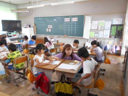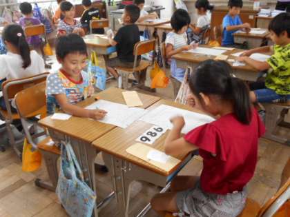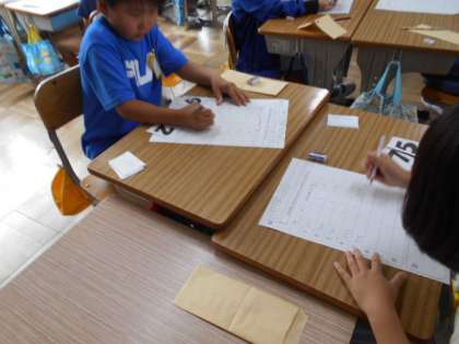 3桁の数字の大きさ比べをします。どの位を見るとどちらが大きいとわかるかを考えます。ゲームをしながら楽しく学習しています。