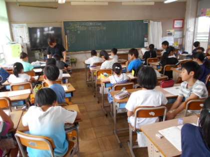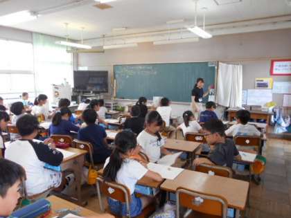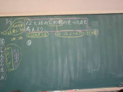 12と16の公約数の見つけ方を考えています。まずは隣の人とペアで話し合っています。そのあと全体で交流をします。