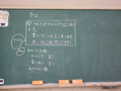 リンゴが全部で12個あります。青いリンゴは5個です。赤いリンゴは何個ですか。という問題です。たし算?ひき算?どうやって計算するのかな。