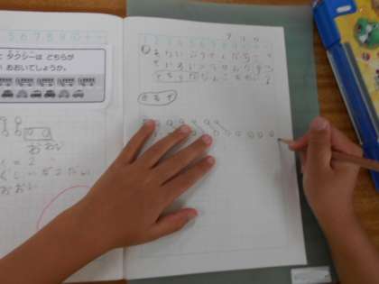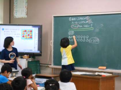 「どちらがなんこおおい?」この問題は何算かを考えています。わかったら,まる図を描いて,答えを確かめます。