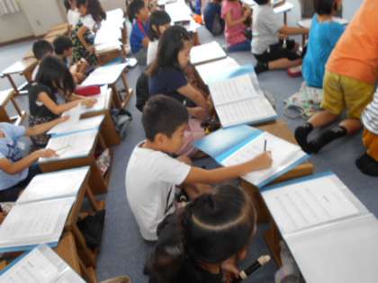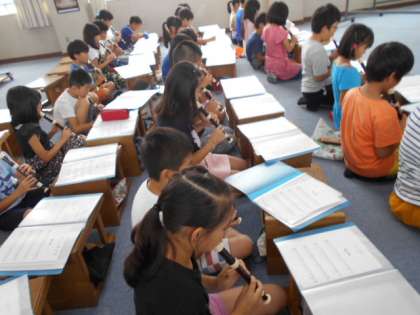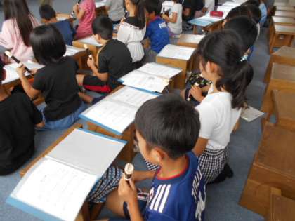 「よろこびのうた」のリコーダー奏をしています。まずは,楽譜と指使いを確認し,そのあと実際に吹いてみます。