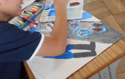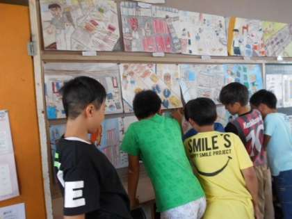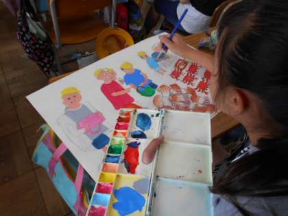 泉佐野漁港に社会見学に行った5年生。漁港の様子をコンテと絵の具を使って上手に表現しています。