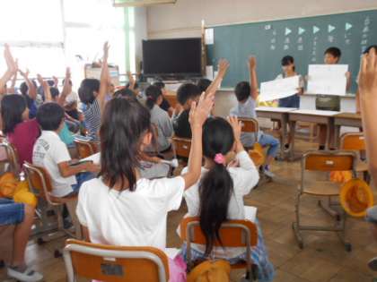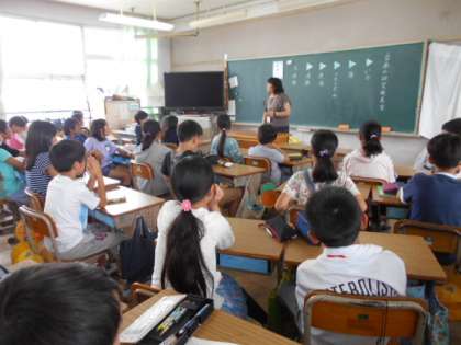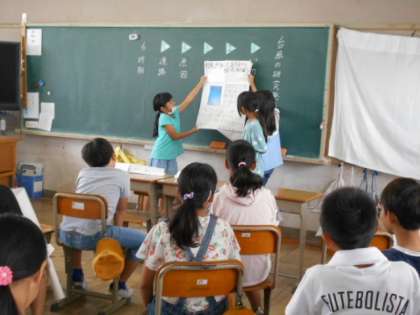 台風について調べたことを,グループ別に発表しています。台風の威力,進路,メカニズム等調べたことを,クイズやニュース番組,実況中継等工夫しながら伝えています。