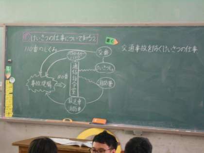 けいさつの仕事の中でも交通事故を防ぐためにしていることは,どんなことだろうか。グループで話し合いながら考えています。