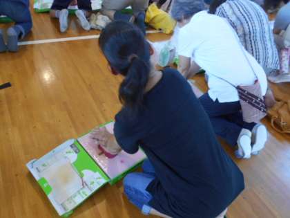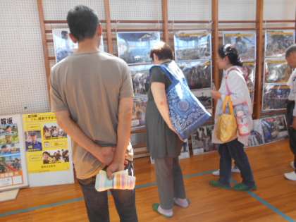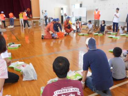 開会式が終わると,各コーナーで訓練です。体育館内には,AEDの心肺蘇生法の訓練や,救助活動の写真展示コーナーがあります。